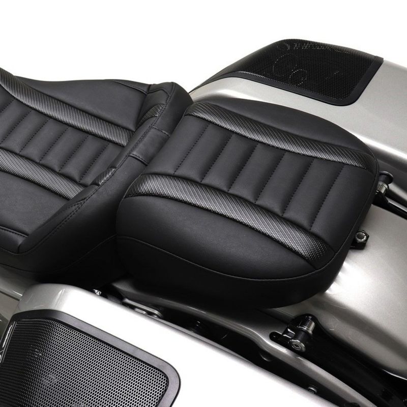 2023以降 CVOロードグライド/ST、CVOストリートグライド、2024以降 ロードグライド、ストリートグライド用 パッセンジャーシートです。 <特長> ●エルゴノミックシェイプの幅広座面と、厚みのある高密度シートフォームが長距離ライディングでの快適性を最大限に高めます ●Mustang(マスタング)のツーリングソロシート(89401、89401GM)との組み合わせ専用品 ●シート表皮はプリーツステッチのセンターパネルとカーボン柄のパネルを組み合わせた、高級感溢れるルックスです ●頑丈なグラスファイバー製シートベースが長時間の乗車でもシートフォームの型崩れを防ぎ、ポリウレタンバンパーが振動を吸収することで快適な乗り心地を維持します ※写真のソロシート、バックレスト、ツアーパックバックレストは別売です。