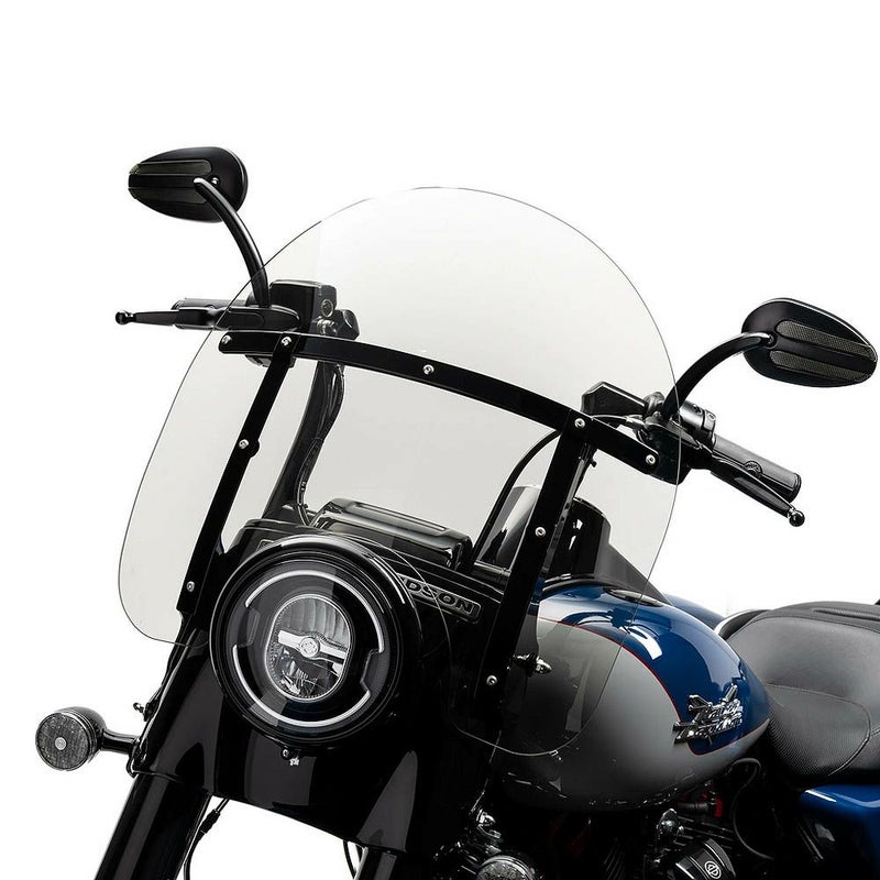 デタッチャブル式のウインドシールド。 工具を使用せずに簡単に脱着出来ます。 シールド本体は、傷に強いハードコーティングされたポリカーボネート製。 ハードウェア部はブラックでダークカスタムを引き立てます。 高さは、ヘッドライト上部からシールド先端までの値です。 フリーウィーラー(FLRT)