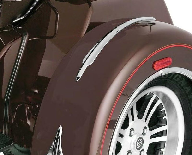 リアフェンダーの上部にクロームのアクセントでドレスアップ。 取り付けは両面テープなので簡単です。 2個セット