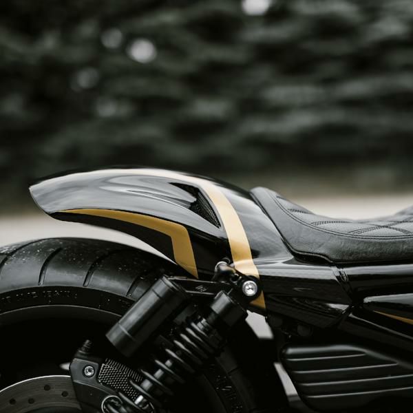 ナイトロッドスペシャルおよびVロッドマッスル用のショートリアフェンダーです。 幅240mm~260mmのリアタイヤに合わせたデザインです。 ヨーロッパのデザインらしい精緻な曲線と直線の組み合わせによって、クールなリアビューになります。 ※Vロッドマッスル(VRSCF)に装着の際は、テールライトとリアフェンダーブラケットをナイトロッドスペシャル用に交換する必要があります。 材質は軽量かつ頑丈なグラスファイバー製。ハンドメイドで製作されています。 グレー・ゲルコート処理済み。 未塗装品。 ※車両装着写真は塗装例です。(参考写真) キット内容: リアフェンダー 専用シート用シートパン 貼り付け用ブラックメッシュ 英文説明書 ※専用シートは別売です。(ST-7ROD) ※取り付けにはリアフェンダーブラケットの加工、ドリル加工およびメッシュ接着が必要です。