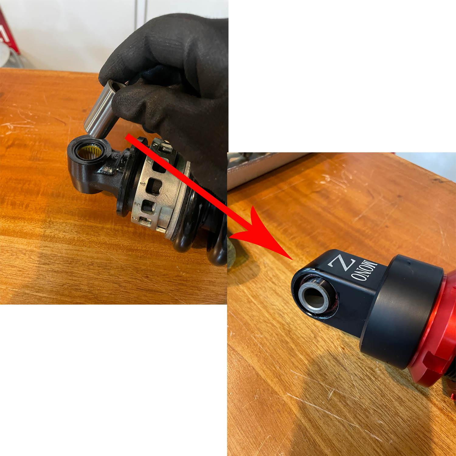 標準のサスペンションから抜いたスリーブは、新しく装着するサスペンションのアンダーに移植する。