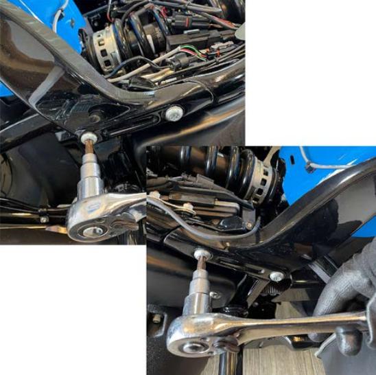 アッパーボルトから入れて、アンダーを締めこむのだが、アンダー側の穴位置が合わない事が多々あるので、その時にはジャッキで高さを調整しながら丁度良い所を探して締めこんでほしい。