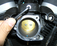 バックプレートを外すと吸気口が見える。両側のシリンダのネジ穴はエアクリーナーを固定すると同時にブローバイガスが出てくる