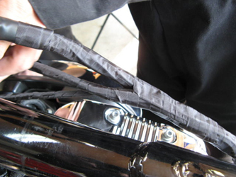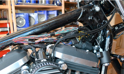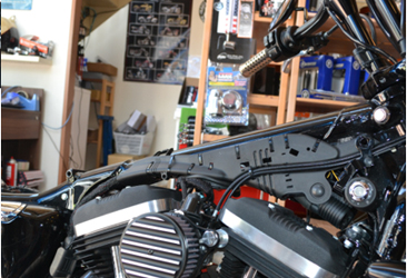 - キットのタンクアップステーにてスポーツスターのタンクをハイマウントする場合、フレーム下部に通っている配線が下から見えてしまうので、フレーム上部を通るように配線を持ち上げ、タイラップもしくはテープで固定する(タンクを載せるのに邪魔にならないように)。
