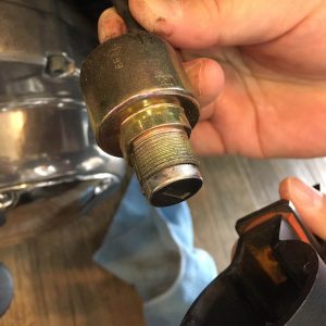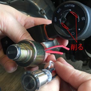 標準装備のキーシリンダーと違いプッシュボタンスイッチは円形の為、削らないとカバーが入らない。