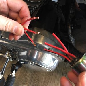 2013以前のスポーツスターは、車両からの3本の配線のうち、赤/灰、赤/黒の2本の線を繋ぎ、プッシュボタンスイッチからの白い配線と繋ぐ。