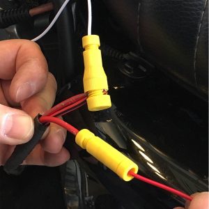 写真のように製品に付属のコネクターを使用しても良いが、出来れば防水のギボシ端子や、ハンダ付けして収縮チューブ等で固定した方が安心だ。