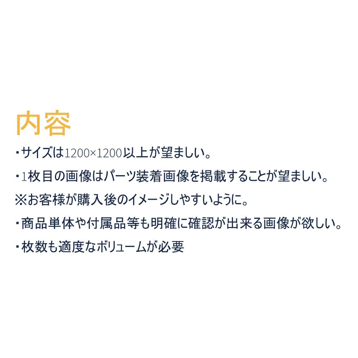 例:【車種名 商品名 カラー等 メーカー】 商品名の中に車種名を可能な限りカタカナ表記する。 複数車種の場合や文字数制限に引っかかる場合はアルファベットにて表記する。【※車種 とメーカーのテキスト配置位置は登録者の判断により適宜入れ替え】